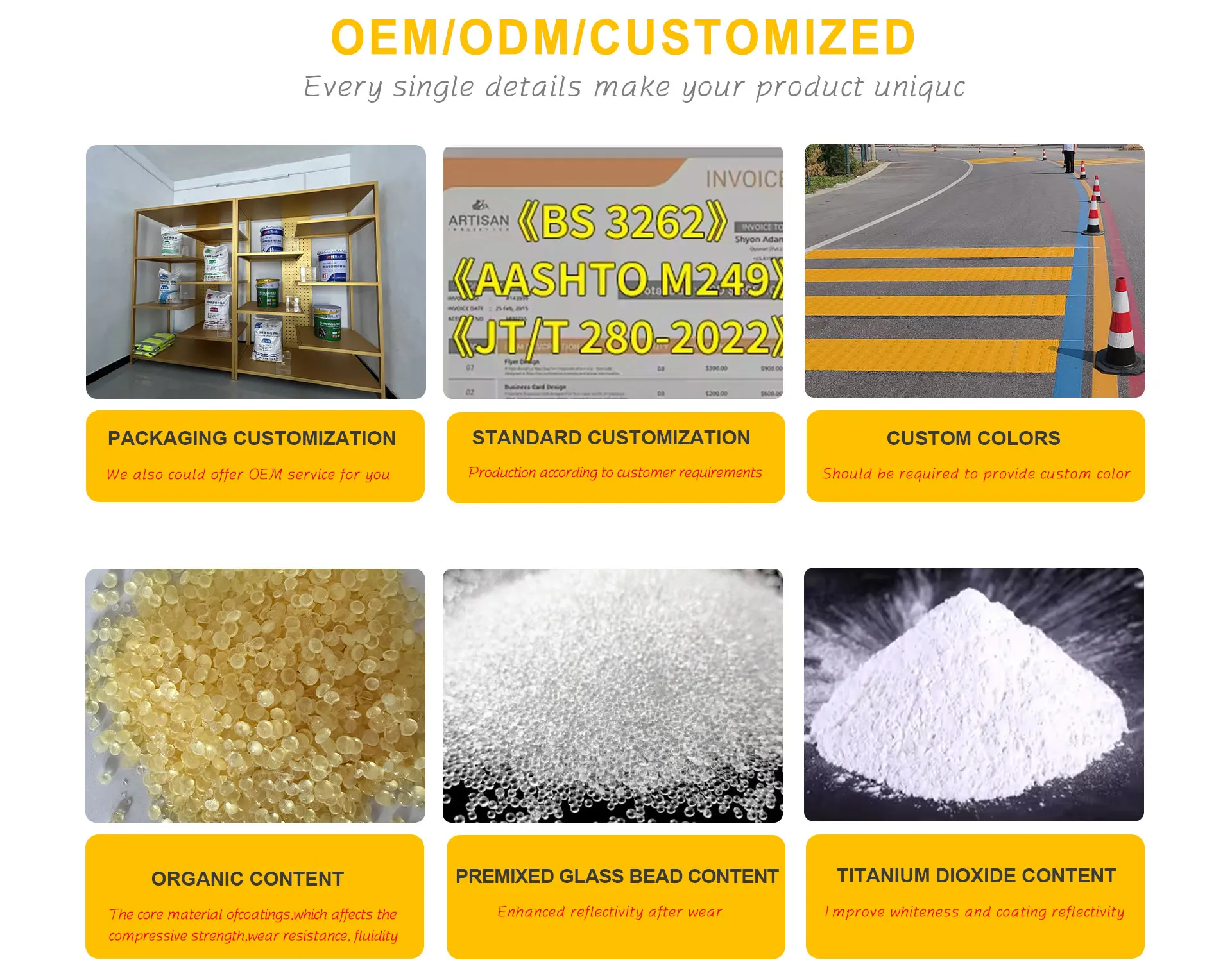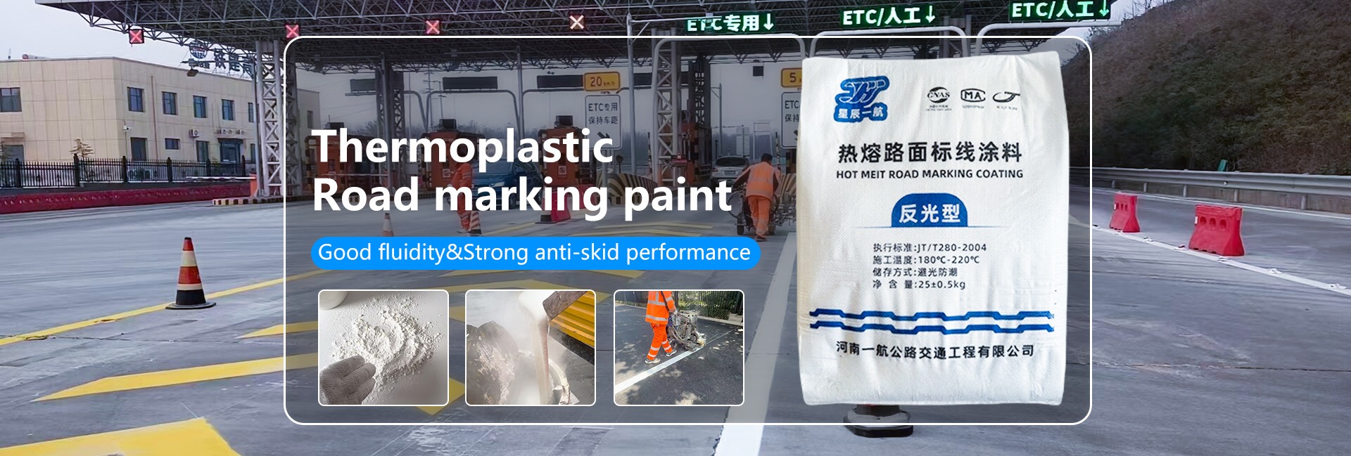 Productos principales:Pintura de señalización vial termoplástica estándar nacional, chaleco reflectante